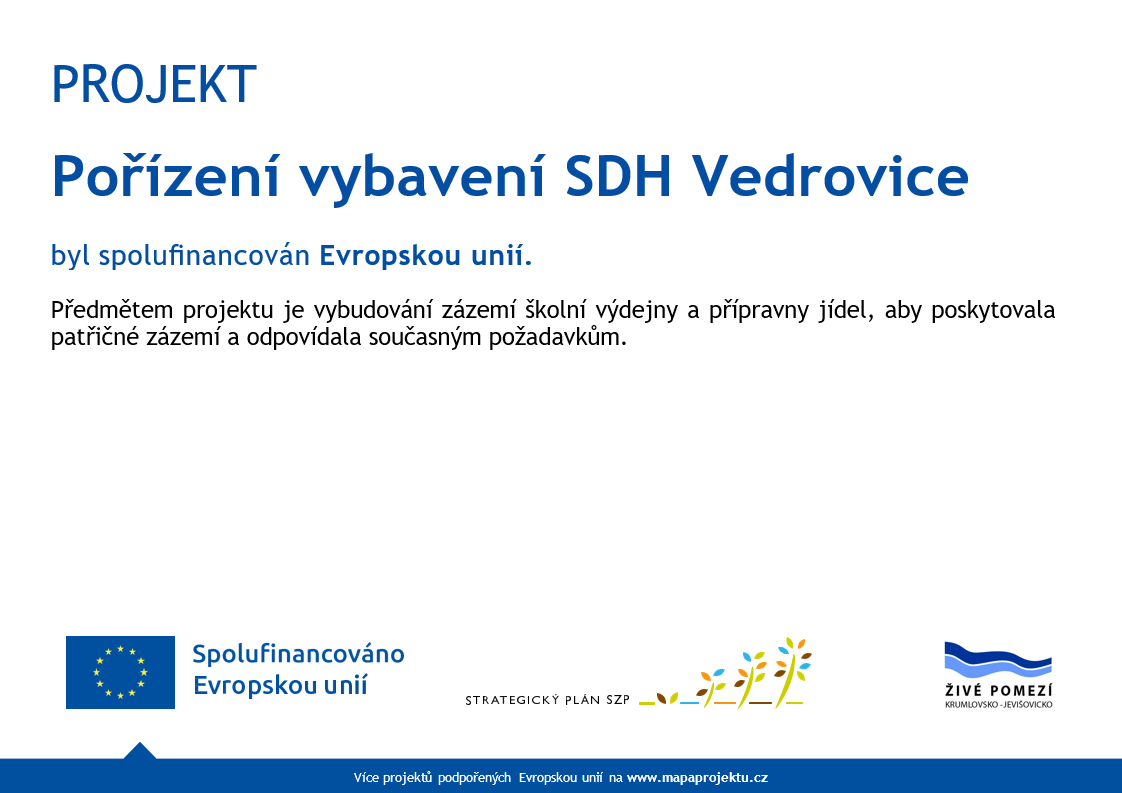 Díky podpoře a spolupráci s místní akční skupinou Živé pomezí Krumlovsko - Jevišovicko, z.s., získal SDH Vedrovice finanční dotaci na realizaci projektu „Pořízení vybavení SDH Vedrovice“. Předmětem projektu bylo pořízení hasičského přívěsu a vybavení hasičské zbrojnice, což přispěje ke zlepšení podmínek a zázemí pro spolkovou činnost. MAS Živé pomezí je klíčovým partnerem v rozvoji našeho regionu a jejím prostřednictvím můžeme realizovat důležité projekty.